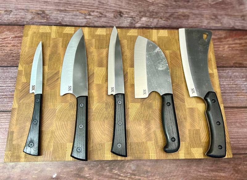 Для отримання консультації ви можете зв'язатися з нашими менеджерами по телефону +38********** або +38**********. Ручна робота Матеріал рукоятки: дерево ясен, металеві стяжки Марка сталі ножів: 1.4116 Твердість сталі ножів, HRC: 58-59 Довжина леза, мм: 170, 160, 120 та 150 Товщина леза, мм: 2,5 та 3 Ширина леза, мм: 35, 56, 25 та 80 Довжина рукояті, мм: 120, 120, 115 та 120 Загальна довжина, мм: 290, 280, 235 та 270 Марка сталі сокири: 50х14мф Твердість сталі сокири, HRC: 56 Довжина леза, мм: 170 Товщина леза, мм: 5 Ширина леза, мм: 80 край леза, 55 біля рукояті Довжина рукояті, мм: 130 Загальна довжина, мм: 300 Маса, г: 550 Вид упаковки: картонна коробка Ножі ручної роботи, зроблені в Україні. Класичний набір якісних ножів для вашої кухні. Якісна німецька нержавіюча сталь 1.4116 - запорука міцності, гостроти та довговічності кожного ножа з цього набору. Клинки ножів виготовлені із нержавіючої сталі марки 1.4116 від німецької компанії TussenKrupp AG. Ця сталь міцна, вона не іржавіє, не покривається плямами. Ножі з неї можна загострити гостро, і цю гостроту вони збережуть надовго. Саме тому нержавіючу сталь 1.4116 використовують для виготовлення ножів та медичного інструменту по всій Європі. Зведення клинка 0,2 мм виконане ручне заточування. Клинок сокири сталь 50х14мф, застосована при виготовленні сікача, відмінно підходить, оскільки вона забезпечує клинок стійкістю на злам, опірністю до зносу, довгим утриманням заточування і не вимоглива в плані якогось особливого догляду. Класичний дизайн, рукояті виконані з дерева ясен - екологічний та солідний матеріал. Ножі виглядають стильно, а їхні рукояті міцні та зручні. Набір чудово впишеться в інтер'єр сучасної європейської кухні. Рукоятки виготовлені з дерева ясен, ножі мають приємний колір. Рукоятки промаслені тунговою олією та полірована карнаубським воском та пастою. Непогано заповнюють долоню, ніде не вминає її, не намагається провернутися. Догляд: Рекомендуємо тримати ножі чистими, сухими, без залишків забруднення після використання. Більше товару тут, переходьте за посиланням: ************************************************