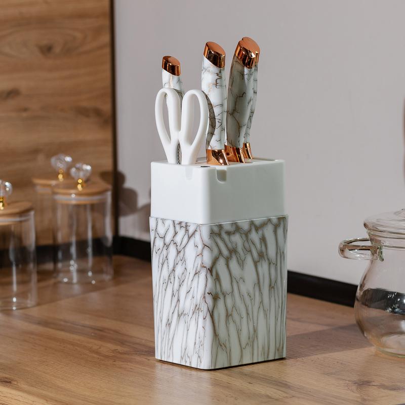 Набор кухонных ножей на подставке – это необходимый инструмент для любой кухни. Он сочетает в себе функциональность, практичность и стильный дизайн, делая процесс приготовления пищи более комфортным и быстрым. Состав набора: Ножи кухонные - 5 шт. Ножницы кухонные - 1 шт. Подставка - 1 шт. Основные характеристики набора кухонных ножей Размер набора: 12 х 9 х 35 см Длина ножей: 33, 30.5, 24.5, 20.5 см Длина ножниц: 20 см Основные преимущества набора ножей Универсальность: подходит для выполнения различных кухонных задач. Практичность: все ножи всегда под рукой. Функциональность: каждый нож имеет свое предназначение. Безопасность: эргономичные ручки и острые лезвия обеспечивают безопасность использования. Экономия места: подставка позволяет компактно хранить набор. Эстетичность: набор может стать стильным дополнением интерьера кухни. Вы можете купить набор ножей и другие товары по доступной цене с доставкой по Украине в нашем интернет-магазине.