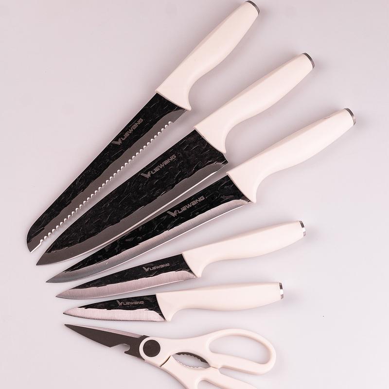 Набір кухонних ножів із нержавіючої сталі – це незамінний помічник для будь- якої господині на кухні. Ножі виготовлені з міцної сталі 5CR15, їхні леза мають алмазне заточування і керамічне покриття, що забезпечує легкість у обробці продуктів і довготривалу гостроту. Ручки з високоякісного поліпропілену мають ергономічну форму, що забезпечує зручний захват і комфортне використання. У набір входять: Кухарський ніж Ніж для хліба Ніж для м'яса Ніж для овочів Ніж для чищення Кухонні ножиці Характеристики: Матеріал ножів: Нержавіюча сталь 5CR15 Лезо: Алмазне заточування, керамічне покриття Ручка: Поліпропілен, ергономічна форма Розмір ножів: 33 см, 24 см, 20 см Переваги: Тривала гострота завдяки алмазному заточуванню Легкість у обробці продуктів завдяки керамічному покриттю Зручність у використанні завдяки ергономічним ручкам Догляд: Рекомендується мити вручну з використанням миючих засобів Сушити на повітрі після миття для запобігання корозії