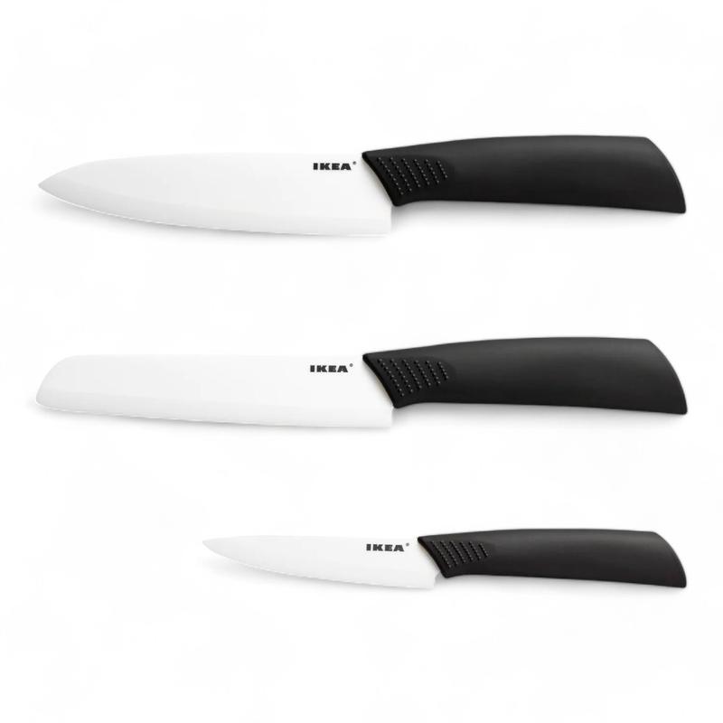 Набір керамічних ножів Ikea Hackig 3 шт. 602.430.91 Виготовлений з керамічного матеріалу, завдяки якому він тримається гострим набагато довше, ніж традиційний сталевий ніж. Включає: 10-сантиметровий ніж для овочів (загальна довжина 22 см), овочевий ніж 16 см (загальна довжина 26 см) і шеф-кухарський ніж 16 см (загальна довжина 26 см). Різання кісток або замороженої їжі може пошкодити керамічне лезо.