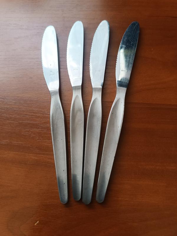 --- 🔪 Набір ножів INOX | 4 шт | зубчасті | імпорт ▪️ Кількість: 4 ножі ▪️ Матеріал: Нержавіюча сталь (INOX — маркування, що означає "не іржавіє") ▪️ Крайка: Зубчаста — ідеально для масла, м’яких сирів, хліба або сервірування ▪️ Ручка: Металева, монолітна конструкція — зручна, збалансована ▪️ Стан: Добрий, з легкими слідами використання ▪️ Походження: Імпорт з Англії, виробництво — ймовірно Аргентина або Італія (за стилем і маркуванням) --- ✨ Особливості: - Універсальні ножі — пасують як для сервірування, так і для щоденного використання - Зубчаста крайка — зручна для нарізання хліба, булочок, м’яких продуктів - Металевий блиск, сучасний вигляд — добре поєднується з іншими приборами - Можна додати до набору з ложками або виделками з аналогічним маркуванням