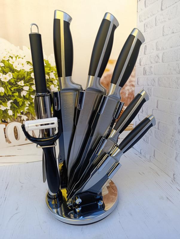 Набір ножів із нержавіючої сталі HausRoland на підставці. Набір ножів включає найпоширеніші на кухні ножі. Леза виготовлені із високоякісної нержавіючої сталі. Цей матеріал обраний невипадково, т.к. відрізняється екологічністю, довговічністю, легкістю заточування та стійкістю до механічних пошкоджень. Ножі ідеально підійдуть для шаткування, чищення, нарізки овочів та фруктів, а також перерубування дрібних кісток. Клинки довго залишаються гострими, а цільнокована конструкція гарантує довговічність виробів. Характеристика: Кількість предметів: 9 Колір леза: сріблястий Колір рукояті: чорний Довжина леза: 12,5 см, 20 см, 16,5 см, 8,5 см Матеріал: нержавіюча сталь Матеріал леза: нержавіюча сталь Матеріал підставки: акрил Вага: 2250 г Країна виробника: Китай Бренд: HausRoland