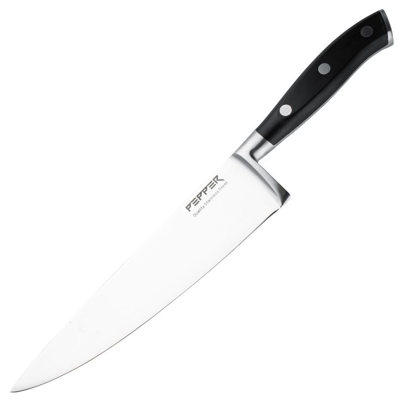 Штрих код: 6902020016334. Призначення: Для швидкого та якісного нарізування різних продуктів. Матеріал виготовлення: Нержавіюча сталь. Призначення: Для быстрого и качественного нарезания разных продуктов. Додатково: Ручка з POM - зносостійкого, твердого матеріалу. Виробник: PEPPER. Країна походження: Китай. Гарантія: Повернення/обмін 14 днів. Тип: Ніж шеф. Габарити: 20.3 см. Кількість предметів: 1. Колір: Чорний/сріблястий.