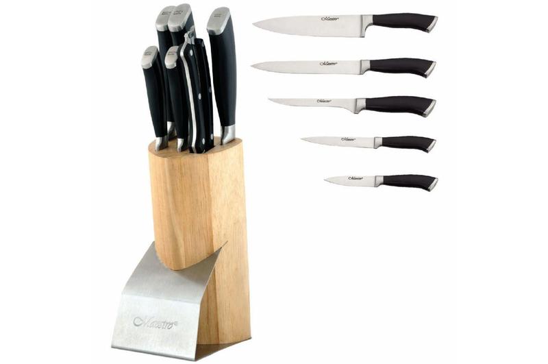 Набор Maestro MR 1421 состоит из 7 предметов: 5 ножей, кухонных ножниц и деревянной подставки. Ножи изготовлены из высококачественной нержавеющей стали. На лезвии с одной стороны нанесен логотип "Maestro", с другой надпись "EDELSTAHL ROST FREI INOX". В торцевой части ручки нанесена надпись с назначением конкретного ножа.