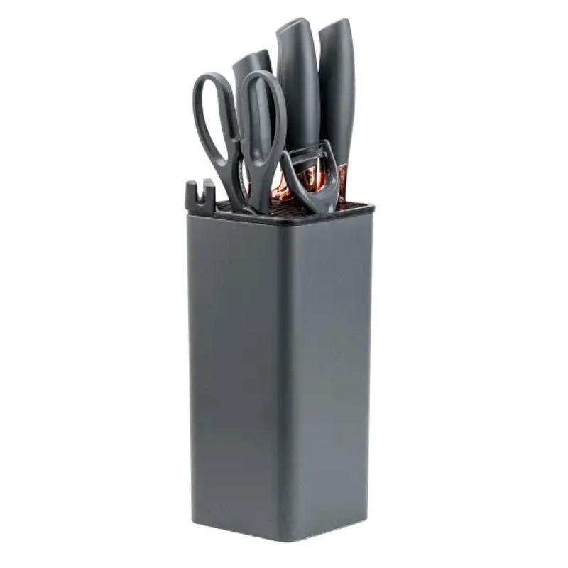 Цей набір кухонних ножів із 7 предметів стане незамінним помічником на вашій кухні. Він забезпечує все необхідне для приготування їжі, від нарізування м'яса та овочів до очищення фруктів і зелені. Ножі виготовлені з високоякісної нержавіючої сталі, стійкої до корозії та пошкоджень, з гострими лезами, які легко ріжуть. Зручні ручки не ковзають у руці, забезпечуючи комфорт під час використання. Характеристики: Матеріал лез: високоякісна нержавіюча сталь. Ручки: зручні, не ковзають. Підставка: компактна, з інтегрованим точилом. Переваги: Стійкість до корозії і пошкоджень. Леза з гострим різом. Інтегроване точило для підтримання гостроти лез. Компактне розміщення на підставці, що економить місце. Догляд: Очищення ножів м'якими миючими засобами. Регулярне використання точила для підтримання гостроти лез. Набір містить: Кухарський ніж Ніж для хліба Ніж для м'яса Універсальний ніж Ніж для нарізки Кухонні ножиці Овочерізка