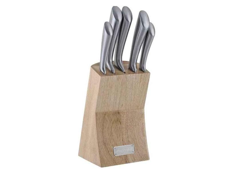 Тип: набор ножей. Количество предметов в наборе: 6. Материал лезвия: нержавеющая сталь. Заточка лезвия: односторонняя. Материал рукоятки: нержавеющая сталь. Тип рукояток: полые. Комплектация: нож для чистки овощей (лезвие 9см, рукоятка 10.5см), нож универсальный (лезвие 12см, рукоятка 11см), нож Сантоку (лезвие 16см, рукоятка 13.5см), нож для мяса (лезвие 20см, рукоятка 13.5см), нож Шеф-кухар (лезвие 20см, рукоятка 13.5см подставка). Тип подставки: настольная. Материал подставки: дерево. ра