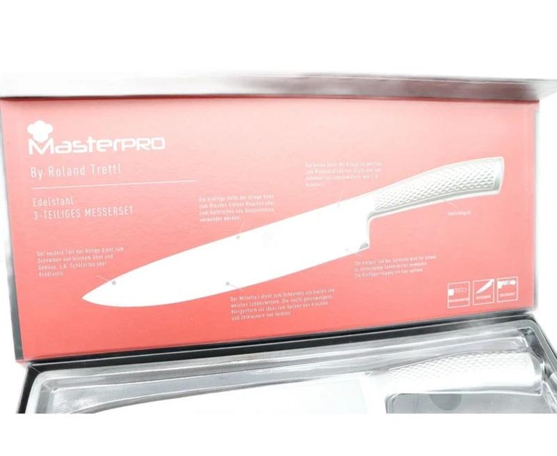 Набір ножів з 3 предметів MASTERPRO від Roland Trettl з нержавіючої сталі Практичний, компактний і стильний набір з колекції EMasterpro, виготовлений з високоякісної нержавіючої сталі. Елегантний і компактний дизайн. Особливості: - ножі з нержавіючої сталі з порожнистою ручкою - можна мити в посудомийній машині Характеристики: - довжина лез: - кухарський ніж: 20 см - універсальний ніж: 12 см - ніж для чищення: 8 см - матеріал леза: нержавіюча сталь - ручка: порожня - вага: - кухарський ніж: 222 г - універсальний ніж: 112 г - ніж для чищення: 107 г
