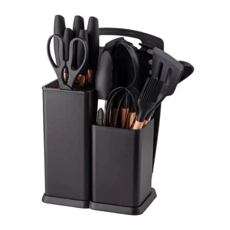 Набор кухонных принадлежностей черный 19 предметов с двойной подставкой разделочной доской...