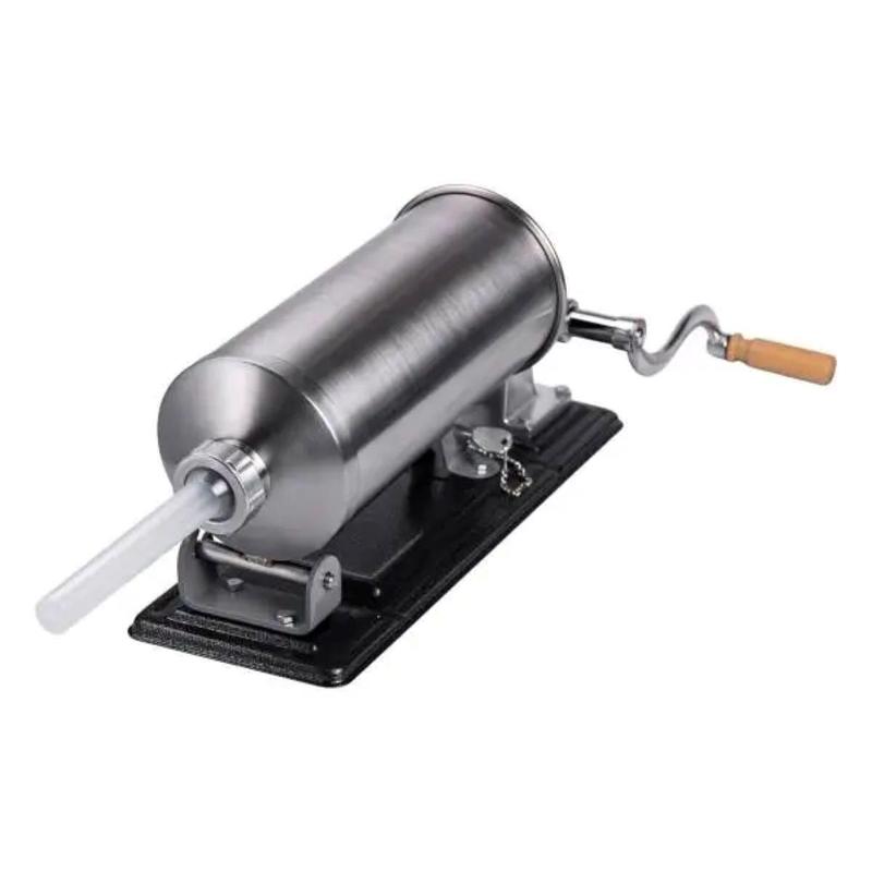 Ручний горизонтальний ковбасний шприц - незамінний інструмент для приготування домашньої ковбаси та м'ясних виробів. Завдяки продуманому дизайну і якісним матеріалам, цей шприц ідеально підходить як для домашнього використання, так і для невеликих виробництв. Зручний в експлуатації та легкий в обслуговуванні, він стане чудовим помічником у приготуванні смачних ковбас. Основні характеристики: Розміри: 44 x 15 x 19 см; Об'єм циліндра: 3 л; Кількість насадок: 4 шт; Діаметр насадок: 14 мм, 18 мм, 22 мм, 26 мм; Діаметр циліндра: 13 см; Матеріал корпусу: нержавіюча сталь; Матеріал насадок: пластик; Матеріал ручки: нержавіюча сталь + дерево; Кріплення: струбцини для надійної фіксації шприца на робочій поверхні; Ключ у комплекті: використовується для закріплення шприца в корпусі та регулювання механізму для більш зручного та безпечного процесу роботи. Переваги: Міцний металевий корпус стійкий до корозії та механічних пошкоджень; Нековзна основа для надійної фіксації на робочій поверхні; Чотири змінні насадки дають змогу готувати ковбаси різних діаметрів; Зручна ручка забезпечує плавний і комфортний хід; Легко розбирається і очищається після використання. Зі шприцом для ковбас ви легко перетворите процес приготування на справжнє задоволення. Він економить час, спрощує роботу з фаршем і дозволяє домогтися акуратного, рівномірного наповнення оболонки. Незамінний інструмент для тих, хто цінує домашню якість, натуральність і контроль над кожним продуктом.
