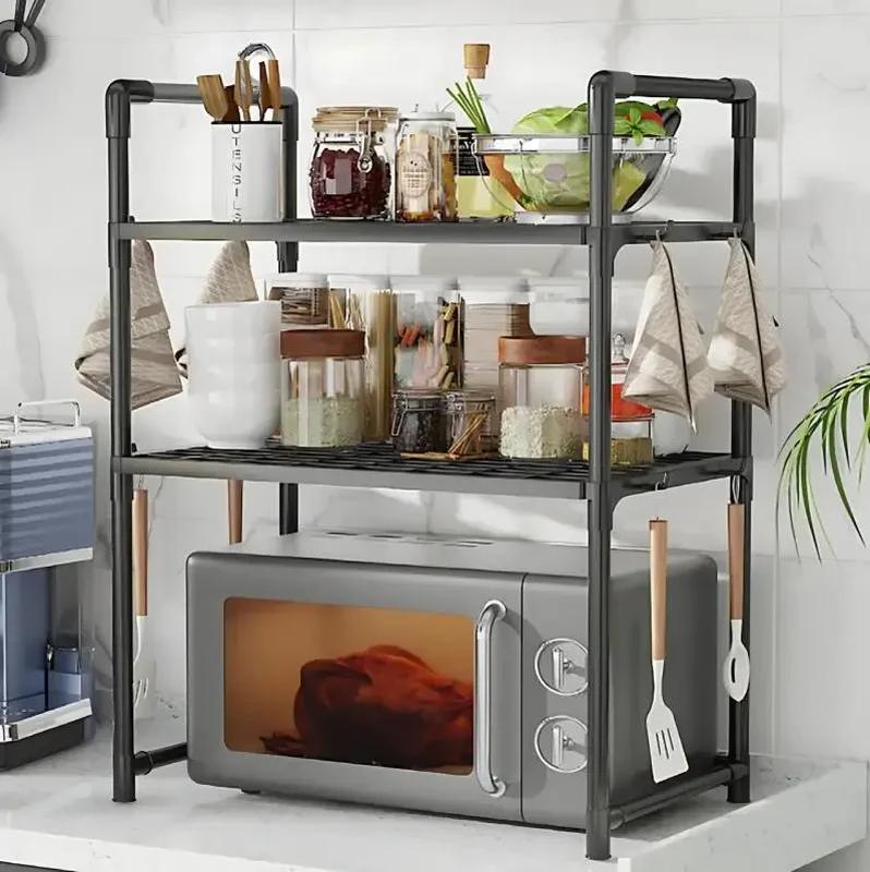 Полиця-стелаж для кухонного посуду з гачками Універсальна полиця для кухні 48х26х71 см Полиця-органайзер для мікрохвильової печі - це багатофункціональний стелаж для зберігання з 2 або 3 рівнями, яка оптимізує використання простору на вашій кухні або у ванній. Ефективне рішення для впорядкування ваших речей, ця полиця виконана з міцного пластику і має стильний мінімалістський дизайн, який відмінно впишеться в будь-який інтер'єр. Піднята конструкція кожного рівня забезпечує зручний доступ до зберігання, що робить процес приготування та повсякденного використання більш комфортним. Переваги: Ефективне використання простору: конструкція дозволяє зберігати більше речей, звільнивши робочі поверхні від безладу. Багатофункціональність: Підходить для зберігання не тільки кухонного приладдя, а й туалетного приладдя та косметики. Зручність доступу: Підняті рівні забезпечують легкий доступ до всіх предметів, спрощуючи організацію та пошук. Довговічність і простота догляду: Виготовлена із міцного та водонепроникного пластику, легко миється та довго служить. Сучасний стиль Мінімалістський та елегантний дизайн додає сучасний штрих до інтер'єру. Характеристики: Матеріал: Пластик Тип: Кухонна полиця Конструкція: 2 яруса Стиль: Мінімалістський та сучасний Застосування: Кухня, вітальня Розмір: 48х26х71