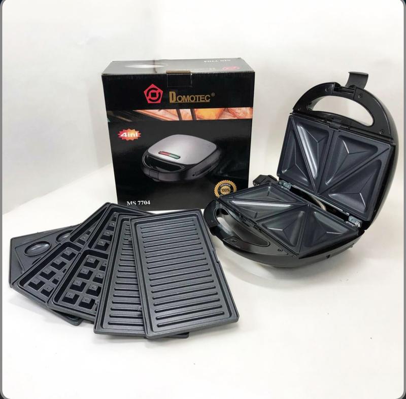 Гриль бутербродниця вафельниця горішниця 4 в 1 Domotec Ms 7704 4 в 1 Гриль, бутербродниця, вафельниця, ліщина Domotec ms 7704, 1000Вт зі знімними формами: Гриль контактний (притискний) Горішниця Бутербродниця (сендвічниця, тостер трикутнички) Вафельниця (товсті бельгійські вафлі, вони ж віденські, брюссельські, гофре) Універсальний прилад з чотирма змінними насадками з антипригарним керамічним покриттям, заощадить місце на Вашій кухні і зробить приготування різноманітних страв швидким і простим. 1000Вт цілком достатньо для домашнього приготування. Для кожної страви окремі знімні форми, що зручно при чищенні вафельниці має світлову індикацію роботи, що означає готовність до випікання або підсмажування. З кожного боку приладу розміщені нагрівальні елементи у вигляді пластин, які стикаються з продуктами, що готуються зверху і знизу – це забезпечує швидке і рівномірне готування в бутербродниці. Немає потреби перевертати продукти як у сковороді Характеристики: Корпус із нержавіючої сталі з функціональністю вентиляційного охолодження Чотири види насадок Розмір насадок: 12 на 21.5 см антипригарні покриття-форми; легко очистити; ручки з теплоізоляцією; ручно-замкова система; терморегулювання; запобіжний термовимикач та термозапобіжник; 2 контрольні лампи для живлення та обігріву; вертикальна основа для зберігання; потужність 1000 Вт; електроживлення 220-230В, 50-60 Гц. Комплектація: Сендвічниця Змінні насадки: 4 шт Упаковка