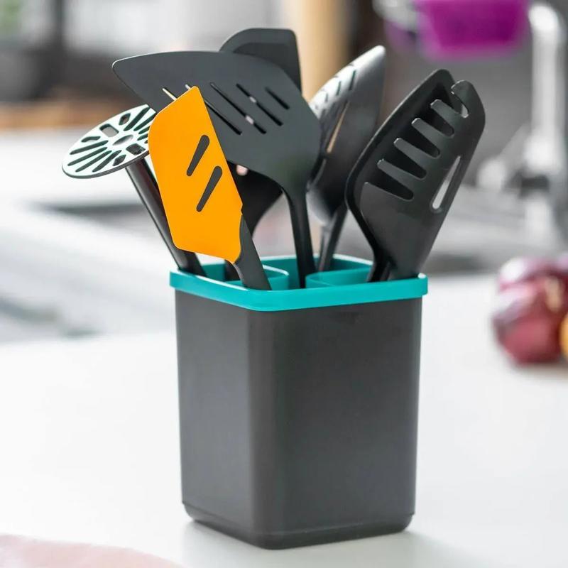 Підставка для кухонних приладів Tupperware Довжина 12 см Ширина 12 см Висота 16 см Підставка розділена на 4 секції, що дає змогу виділити окреме місце для кожного типу приладів і забезпечити рівномірний розподіл навантаження, забезпечуючи їй стійкість. Може використовуватися як контейнер Кубікс за наявності кришки з набору. Завдяки знімній вставці-роздільнику підставку зручно розібрати і промити вручну або в посудомийній машині. Дуже важливо компактно розмістити кухонні прилади на кухні, особливо, маленькій. Всі прилади Tupperware з колекції «Диско» можна повісити на гачок, а можна поставити в підставку. Коли прилади перебувають у підставці, вони завжди на виду і під рукою. Підставка квадратної форми дуже компактна, вона ставиться в кут кухонного гарнітура. У підставці є роздільник, який ділить підставку на 4 розділи. У ній відмінно поміщаються найосновніші кухонні прилади: силіконовий скребок, ополоник, шумівка, лопатка. Зручність підставки в тому, що ви можете її в будь-який час перенести на нове місце. Для зручності миття підставка повністю розбирається Акції місяця від компанії Tupperware тут