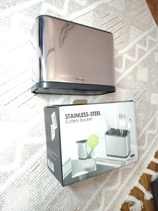 + Є піддон знімний + є отвори щоб зливати зайву водичку з обох боків + Верх з відсіками також знімається + з нержавіючої сталі Розмір: близько 18*8,6*13 Зручне зберігання приладів Можно використовувати як сушилку для столових приладів Залишки від зняття етикетки (інший підтон металу) При загальному плані не видна