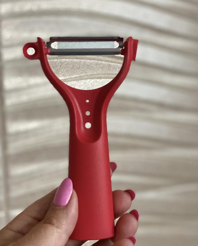 Двойное лезвие - прямая и зубчатая сторона. С одной стороны лезвие ровное для чистки овощей и фруктов, нарезки сыра, а с другой стороны - с маленькими зубчиками для снятия кожицы с томатов, персиков, киви. Заострённый выступ на овощечистке легко режет кожуру цитрусовых, а широкий выступ под ним помогает очисть их от кожуры. На овощерезке есть 3 отверстия, которые помогают отделит листья зелени от стеблей. Петелька помогает извлечь «глазки» у картофеля. Чем тоньше снимаемая шкурка, тем больше полезных веществ остается в овоще. Овощечистку не рекомендуют мыть в посудомоечной машине. Из-за температурной обработки лезвие может стать менее острым, но его без труда можно вынуть, если слегка разжать боковые стенки.