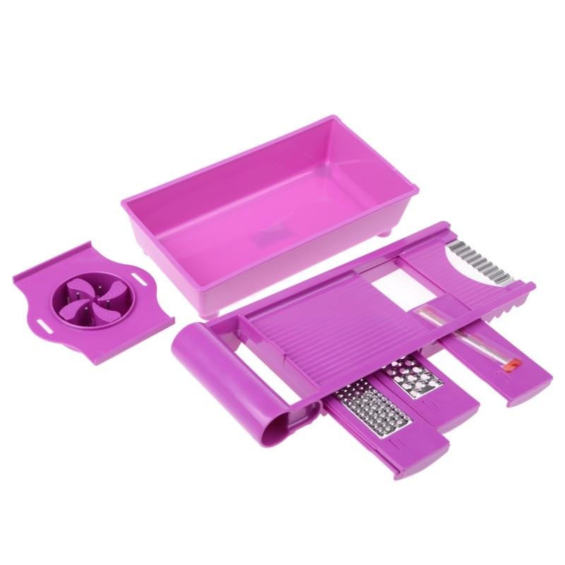 Тертка для овочів і фруктів – необхідна річ на кожній кухні. Виготовлена вона з пластика і нержавіючої сталі. Тертка має тримач для продуктів, чотири насадки: для дрібної нарізки, для великої нарізки, для нарізки тонкими скибочками. Поставте потрібну насадку в відсік, щоб отримати скибочки необхідного розміру. Також до комплекту входять контейнер. Такий набір фіолетового кольору – це практичний і яскравий аксесуар для кожної кухні.