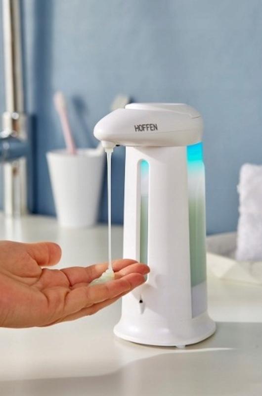 Дозатор для мыла с датчиком движения немецкого бренда Hoffen в белом цвете. Дозатор мыла Hoffen идеально подойдет для туалета, кухни или мастерской. Устройство имеет встроенный датчик движения, позволяющий дозировать жидкость при приближении к нему руки. Светодиодная подсветка уровня мыла позволяет контролировать содержимое контейнера во время выдачи. Устройство работает от аккумулятора, поэтому его можно использовать где угодно. Дозатор изготовлен из безопасного и прочного материала ABS. Объем мыльной камеры: 330 мл.Автоматическая подача мыла с помощью датчика движения.Индикатор максимального заполнения.Легкое наполнение.Индикатор уровня мыла.Незаменимая вещь в каждой ванной комнате.Живление от батареек (в комплекте) Технические данные: объем330 мл.Питание 6В, 4 батарейки ААА 1,5 (батарейки в комплекте). Хороший вариант на подарок и незаменимая вещь в вашем доме.