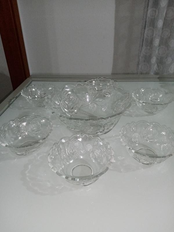 Набор салатник, фруктовница и 6 пиал стеклянные из Италии. Очень красиво смотрится на столе. Высота салатника 9 см, диаметр основания 10см, сверху 22,5см. Высота пиалы 5см, диаметр основания 5,5см, сверху 12,5см. На салатнике сверху есть рисуненький скол (последнее фото),
