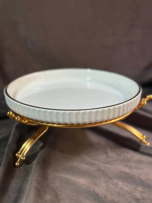Тарілка сервірувальна yiwu lb-1570g порцелянова на металевій підставці 20 см білий з золот...