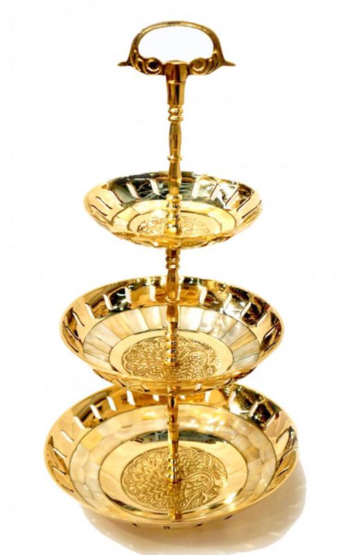 Цукерниця 3 яруса Shell жовтий метал Розмір: 17*17*32 см Посуд із латуні — яскравий, ошатний та святковий. Дивлячись на такий посуд, уявляєш красуню Шахерізаду, яка своїми тонкими витонченими пальчиками бере шматочок рахіт-лукуму з страви, прикрашеного перламутром; з чайника з довгим носиком наливає освіжний напій у келих, прикрашений зображеннями павичів і райських птахів, а в латунній вазі пахнуть щойно зірвані розкішні заморські квіти... Тонкий звук латунного дзвіночка повідомляєndem про те, що час запалити свічки в латунних свічках. І нова казка, і нове диво, і ще одна східна ніч... Одним словом, хочеш східну казку — покупай посуд із латуні.