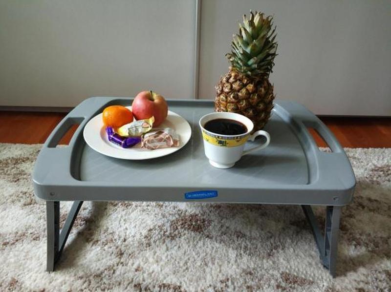 Столик для сніданку із пластику в ліжко складаний ліжковий столик Сірий Столик універсального призначення: для догляду за хворими, для сніданку, для дитячих ігор та творчості, для ноутбука, пікніка та пляжного відпочинку. Столик для сніданку в ліжко: 1. Легкий 2. Харчовий пластик 3. Складаний 4. Добре миється 5. Посуд не ковзає 6. Ручки вбудовані 7. Легко та компактно складається. 8. Бортики 2 см. 9. Стійкий при їжі в ліжку, сидячи та лежачи. 10. Можна використовувати як тацю. Характеристики: Матеріал - Пластик Колір - Сірий Ширина - 320 мм Довжина - 545 мм Особливості - З ніжками Форма - Фігурна Ручки - Є