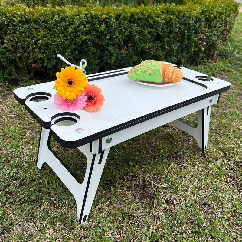 Можна використовувати як підставку для ноутбука, для подавання сніданку, для настільних ігор, для занять із дитиною, зручно взяти із собою в дорогу або для відпочинку на природі. Можна поставити на ліжко, що робить дуже зручним чаювання в ліжку або роботу за ноутбуком. За потреби Ви можете скласти або розкласти, що дасть змогу зробити собі максимальний комфорт. Материал: ХДФ Габарити: 60х30x5,5 см, 8 мм