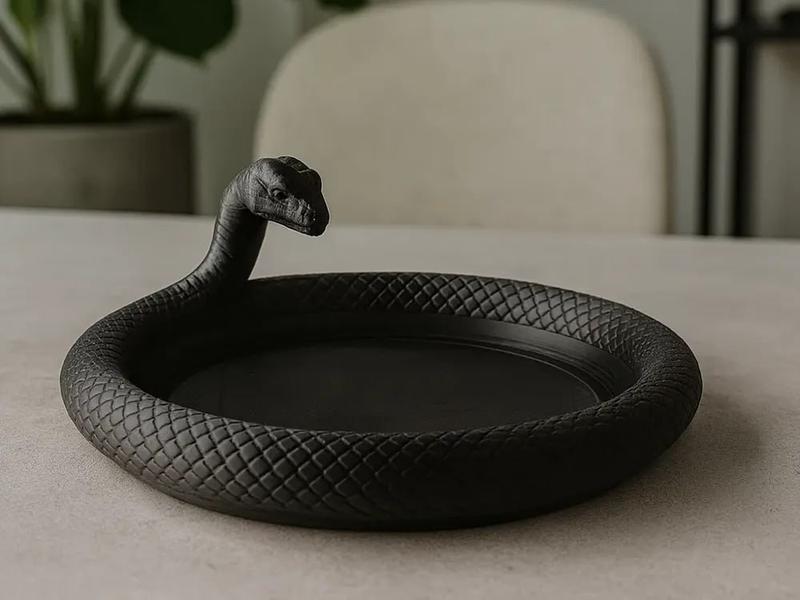 Піднос «Зміїне коло» – тарілочка для ювелірних виробів та декору Піднос «Зміїне коло» – це вражаючий скульптурний виріб, створений для тих, хто любить декор зі сміливим, містичним відтінком. Загорнута в ідеальне кільце, текстурована змія створює всю рамку підноса – її детальна луска утворює драматичну облямівку, а піднята голова виступає зі спокійною, пильною елегантністю. Цей матово-чорний дизайн відчувається одночасно сучасним і символічним: частково готичним, частково мінімалістичним, частково старовинним шармом. Гладка внутрішня тарілочка забезпечує практичне місце для ювелірних виробів, ключів, дрібних аксесуарів або кристалів, тоді як згорнута змія додає сильної художньої присутності. Це той тип предмета, який миттєво перетворює комод, тумбочку, туалетний столик або полицю на сцену з характером. Форма змії багато деталізована, з ретельно сформованою лускою та тонким вигином горловини, що робить весь виріб живим. Незважаючи на свій драматичний вигляд, піднос залишається збалансованим і функціональним – практичний органайзер, замаскований під невеликий витвір скульптури. Золотий, зелений, білий, оливковий, синій, червоний, білий в крапочку, беж, сірий, чорний, рожевий, сірий, глина, эсть також білий , чорний, сірий матові ! Якщо цікавлять інщі кольори запитуйте. Розмір 63 мм 174 мм 174 мм