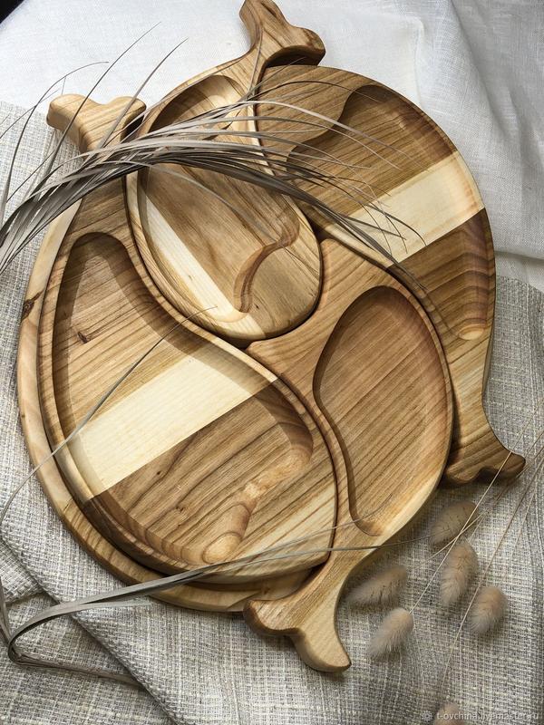 Розмір в складеному вигляді 50 х 30 див. Набір складається з 4 тарілок у вигляді рибок і одного підноса. Дерево дуб, черешня, ясен.
