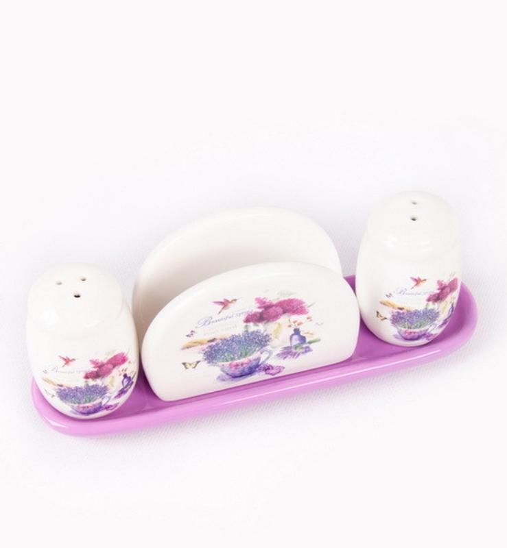 Набор для соли и перца с салфетницей на керамической подставке. Размер: солёнка 5x5x7, 5см, перечница 5x5x7, 5см, салфетница 10,5x4,5x8см, подставка 22.5x6.5x2см. Транспортировочный размер: 23x7x8, 9см. Материал: керамика. Молочный цвет с декоративным рисунком. Предназначена для ежедневного использования или сервировки праздничного стола. Легко моется и чистится