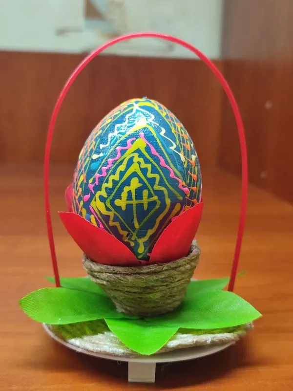 Яйцо выполнено из дерева,расписано лаком. Подставка сделана из пластмассы и обмотана веревкой (бечевкой). Цветок и листья сделаны из ткани и проклеены клеем для водостойкости и для того чтобы сохранялась форма.