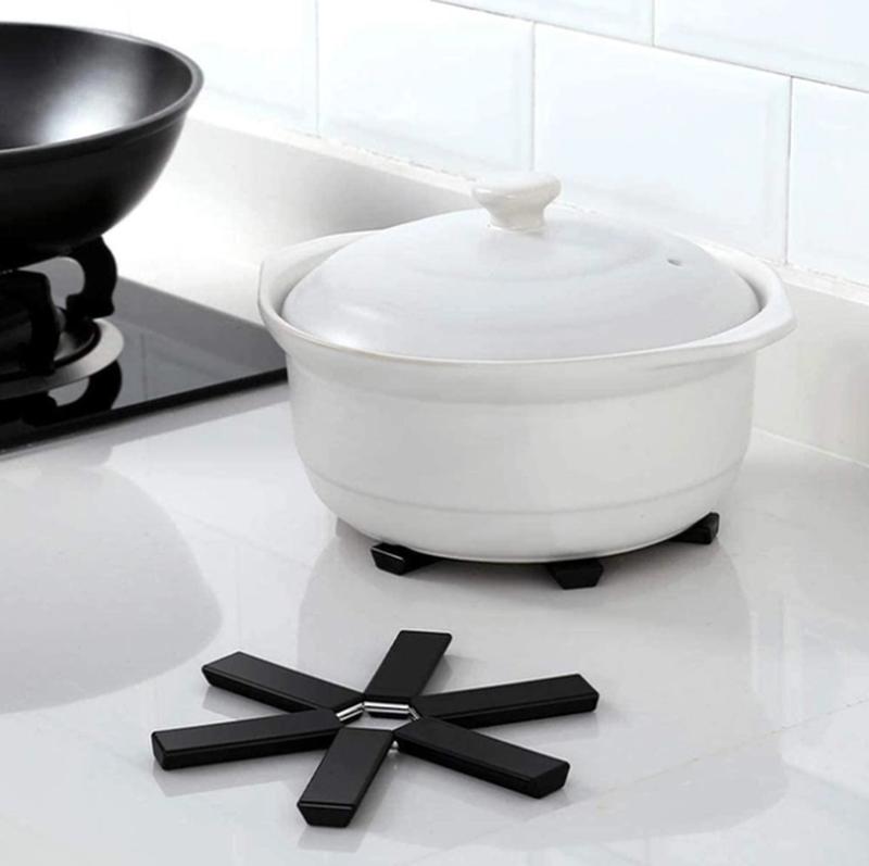 Подставка под горячее Folding Pot Mat для кухни Чёрная Подставка под горячее Folding Pot Mat - это термостойкая подставка предназначенная, чтобы защитить поверхность стола от воздействия высокой температуры. Благодаря подставке вы можете подавать блюда на стол прям из сковороды или кастрюли. Не займет много места, складная и компактная, удобно хранить. Складная подставка имеет нескользящую поверхность, поэтому сковорода или кастрюля не будут скользить. Изготовлена из хорошего материала ABS, имеет прочную структуру и термостойкая. Преимущества подставки Folding Pot Mat: 1. Широкое использование: складной коврик для кастрюли является отличным помощником на кухне и в столовой, может использоваться как держатель для чайника, для кофейника, подставки под горячее для приготовления пищи. 2. Складной держатель для посуды изготовлен из термостойкого материала. 3. Отличный дизайн, который не только впишется в любой интерьер, но и сэкономит Ваше место на кухне. 4. Держатель не выделяет запахов при нагревании. 5. Можно сложить для удобного хранения. Характеристики: - Тип: подставка под горячее; - Применимая температура: от -20 до +220 по Цельсию; - Материал: АБС-пластик; - Размер: 19 х 19 см; - Цвет: черный.