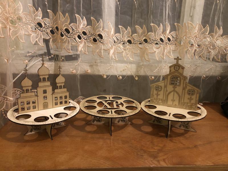 Товар власного виробництва Пропонуємо підставки під Пасхальні Крашанки з високоякісної шліфованої фанери товщиною 3 мм Ціна підставок з церквами ( вертикальною частиною) 135 грн за 1 шт Ціна без вертикальної частини 100 грн