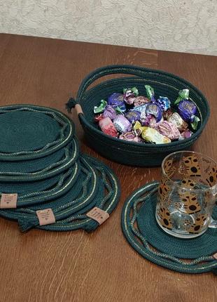 Набор подставок под чашки ( 6 шт) + корзина для сладостей, вышитые люрексными нитями. Изготовлено из хлопкового шнура 5 мм. Подставки защищают Ваш стол от царапин и воздействия горячих температур.