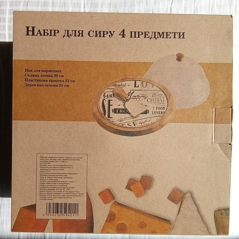 Ціна за весь набір 2600 грн. olx . ua / d / obyavlenie / nabr-doshka-pdstavka-nzh-struna-lra-narzk-myakih-sirv-brie-camamber-IDXLpwJ . html Округла та класична дошка для подавання сирів виготовлена з букового дерева з прозорим акриловим ковпаком, стильний і механічний елегантний аксесуар для сирних-сомельє підходить будь-якій дегустації на банкетах, презентаціях, кулінарних подій, пікніку, кухні та романтичній дегустації в парі; дошка має діаметр 21 см, має знімну скляну поверхню, що надає їй елегантного та сучасного вигляду, до комплекту входять, компак-клош тримач, букова дошка, скло, ліра, два ножі з неіржавкої сталі: (a mini KHISEL KNIFE) дерев'яна ручка та мінініж для різання твердих сирів, як-от пармезан або манчего, вони обладнані товстішим і міцнішим лезом, яке легко справляється з нарізанням навіть найжорсткіших сирів, забезпечуючи акуратніші та рівні скибочки, прозорий акриловий ковпак надійно захищає сири та, у поєднанні з високоякісними ножами, ця дошка створить ідеальні умови для сервірування сиру та стане незамінним аксесуаром для цінувальників делікатесних сирів і гастрономії. Набір аксесуарів та інвентарю для подавання та нарізання Сир із суцільного дерева матеріалу Бук, товщині дошки 15 мм. Ø діаметром 24,6 см./мм. /скло з принтом Ø-діаметром 19 см. - толща скла 4 мм. підставка з прозорою кришкою-компаком клоше-[cloche], матеріал акрил Ø-діаметром 21,7 см./мм. - висота ковпака 10,5 см./мм., загальна висота 14 см., вага 0,762 грама, набір із двома мінізами *неіржавкої сталі* в наборі ці ножі для твердих сирів мають товстіше та міцніше лезо 0,1 мм. KNIFE* довжина гострої частини леза 48 мм, висота 61 мм. /a mini *CLEAVER KNIFE* довжина гострої частини леза 73 мм, висота 40 мм. з лазерним гравіюванням-логотипом] Ціна за весь набір 2600 грн. Додатково тонка Струна-Ліра — *a Wire Cheese Cutter* для нарізання м'яких Сирів — Бри/Камамбер/Блю Сир, виготовлена з металевої хромованої оправи та тонка струна з неіржавкої сталі, наявність — тільки одна струна! довжина суцільної оправи 38 см струни 30 см ширина 15 см діаметр оправи 4 мм вага 60 грамів матеріал неіржавка хромована сталь. Ціна за набір 2,600 гривень
