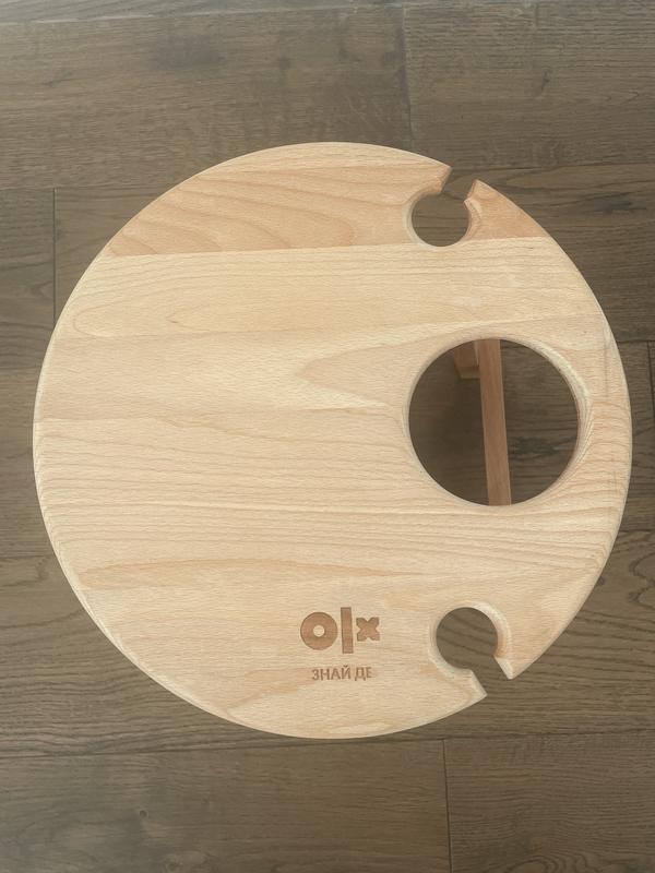 Піднос з дерева для вина, бокалів, фруктів. На природу / на пляж / в ліс. Діаметр 35 см, висота ніжок 16 см. Коректний відтінок столика передають 1 та 2 фото в оголошенні. Можлива Безпечна оплата Укрпошта / Нова пошта / Rozetka