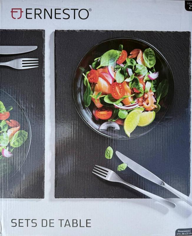 Це комплект з двох елегантних прямокутних підставок для сервірування столу. Вони призначені для захисту поверхні столу від тепла, вологи та подряпин під час прийому їжі. Стильний чорний дизайн з імітацією сланцю додає сучасного вигляду сервіруванню. Розмір кожної підставки -- приблизно 38 × 31 см. Матеріал легкий у догляді, поверхню легко протирати вологою серветкою. Ідеально підходить для щоденного використання вдома або для особливих подій