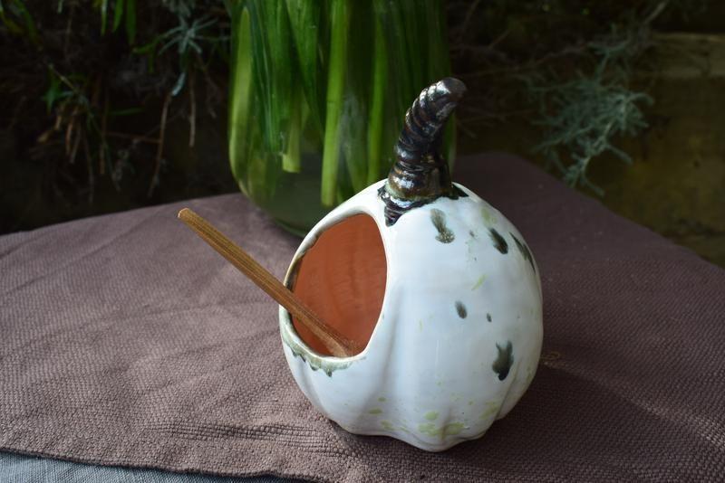 Керамічна цукорниця у формі гарбузика. Стильна та оригінальна. Дуже приємна на дотик та зручна в користуванні. Зовні приємний білий колір з дрібними світлозеленими вкрапленнями, всередині оранжевий. Хвостик покритий цікавою бронзовою глазуррю. Зручний для цукру рафінаду, а також горнішків. лукуму та меду. Гарний подарунок на Хеллоуїн! Місткість - 0,15 л
