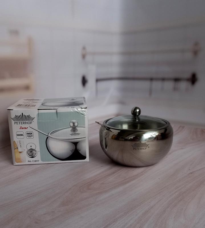 Сахарница 560мл Peterhof PH-12897 Характеристика: Обьем: 560мл Материал крышки: стекло и нержавеющая сталь. Материал: высококачественная нержавеющая сталь. Можно мыть в посудомоечной машине: Да.