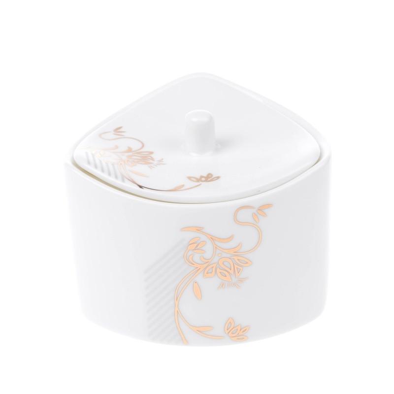 Цукорниця Антонеллі виготовлена з кістяної порцеляни – вишуканого матеріалу, який характеризується хімічною і термічною стійкістю, особливою тонкістю і білосніжним кольором. Вона нагадує форму трикутника, декорована квітковим візерунком сріблястого кольору. Якщо ви хочете створити теплу атмосферу під час чаювання, така цукорниця повинна з'явитися на вашому столі. Вона стане прекрасним подарунком на річницю весілля або новосілля. Ви можете купити цукорницю окремо або в комплекті з сервізом, в який також входять чайник, молочник і чашки з блюдцями.