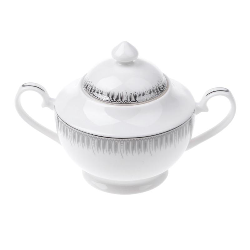 Цукорниця Джордано виготовлена з кістяної порцеляни – матеріалу, який характеризується термічною і хімічною стійкістю, тонкістю і білосніжним кольором. Виріб прикрашатиме святковий стіл, оскільки декорований оригінальним візерунком сріблястого кольору. Якщо ви любите процес чаювання і хочете створити теплу атмосферу, така цукорниця повинна з'явитися у вашому домі. Вона стане чудовим подарунком на порцелянове весілля. Ви можете купити цукорницю окремо або в комплекті з сервізом, в який також входять чайник, молочник і чашки з блюдцями.