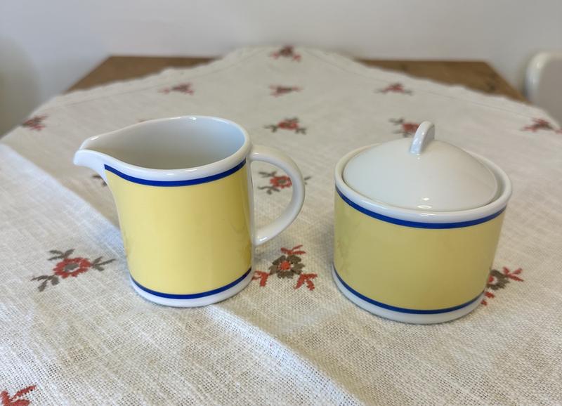 Молочник и сахарница с крышкой. Привезён из Германии. Кружка и сахарница изготовлены из качественного фарфора (Q u a l i t ä t s p o r z e l l a n) ипринадлежат к коллекции H a p p y H o u r С желтым корпусом и тонкими синими полосами в стиле модерн середины века. Высота примерно - 7см. Диаметр примерно - 6см. На маркировке указано, что они пригодны для использования в посудомоечной машине и микроволновой печи. ЕСТЬ ВИДЕО Вышлю на вайбер или telegram Вопросы лучше задавать через текстовые сообщения на Шафа, вайбер или telegram !!! Обрати ВНИМАНИЕ !!! СДЕЛАНО в Германии и ещё Отправка только Новой Почтой
