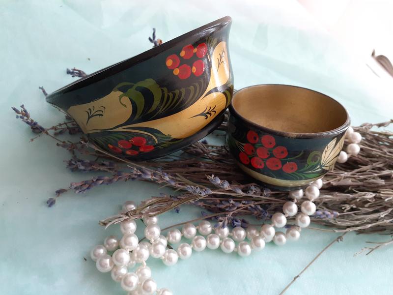 Аппетитные формы, наполненность до краёв цветом и русский дух! Это Хохлома - старинный народный промысел, родившийся в XVII веке в округе Нижнего Новгорода - декоративная ручная роспись деревянной посуды, выполненная чёрным, красным, зелёным цветом по золотому фону. Комплект "Рябинушка" из двух миниатюрных деревянных вазочек или сахарница и солонка в уникальном медово-золотистом цвете, придающим лёгкой деревянной посуде эффект массивности. Мастерство художника восхитительно! Декорированы традиционным хохломским рисунком - красные сочные ягоды рябины. Мягкие тона темперной краски и детально проработаны золотом. Небольшие, имеют удобную обтекаемую форму. Сахарница высотою 5 см, в диаметре 10 см, солонка - 4 см, диаметром - 6,5 см. Состояние отличное, "сервантное" хранение. Эффектные вещицы с легкой ноткой ностальгии. Палитра, блеск, невероятно душевный и понятный каждому рисунок, — все это пронизано теплом и свежестью ясного осеннего дня! Порадуют ценителя, украсят застолье, полноценный декоративный элемент кухни. Цена указана за 2 предмета