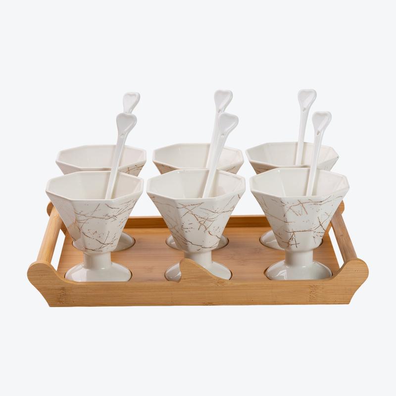 Елегантні креманки в наборі шести штук. Виготовлені з білої кераміки, вони ідеально підходять для подачі різних десертів, свіжих фруктів, холодного морозива та освіжаючих салатів. Основні характеристики набору креманок 6 креманок, з ложкою Об'єм 200 мл Розмір набору 36,5 x 23 x 18 см Дерев'яна підставка Ніжка не тільки підкреслює красу, але й забезпечує комфорт при триманні. Цей набір – ідеальний подарунок для тих, хто хоче додати елемент вишуканості у свій домашній декор. Оперативна доставка у всі регіони України.
