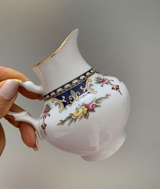 Вінтажний глечик, соусник із ніжним малюнком і позолотою з порцеляни. З клеймом. Португалія. Підійде для вершків, молока, олії та інших рідин. В ідеальному стані, без відколів, тріщин і кракелюру. Висота 11 см. Є ще предмети з таким малюнком, можна зібрати набір.