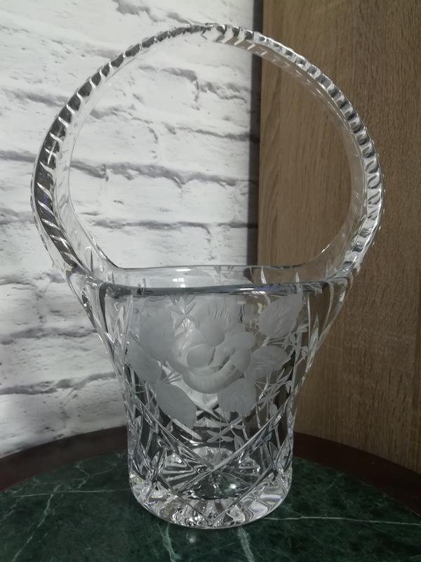 Ваза - корзинка, хрусталь, Чехия. Идеальное состояние, без дефектов, витринное хранение. Ваза большого размера, высота 30 см, ширина ручек 21 см, диаметр отверстия 15×17 см, глубокая. Полуторалитровая бутылка для сравнения размера. Очень тяжёлая, почти 3 кг. С двух сторон нанесен матовый рисунок, что делается не часто. Пересылаю только новой почтой.