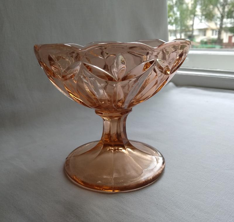 Вінтажна цукерниця кольорове марганцеве скло. Гарна рідкісна форма та колір. Висота 11 см діаметр 12 см. Стан по фото гарний б. у. без пошкоджень.