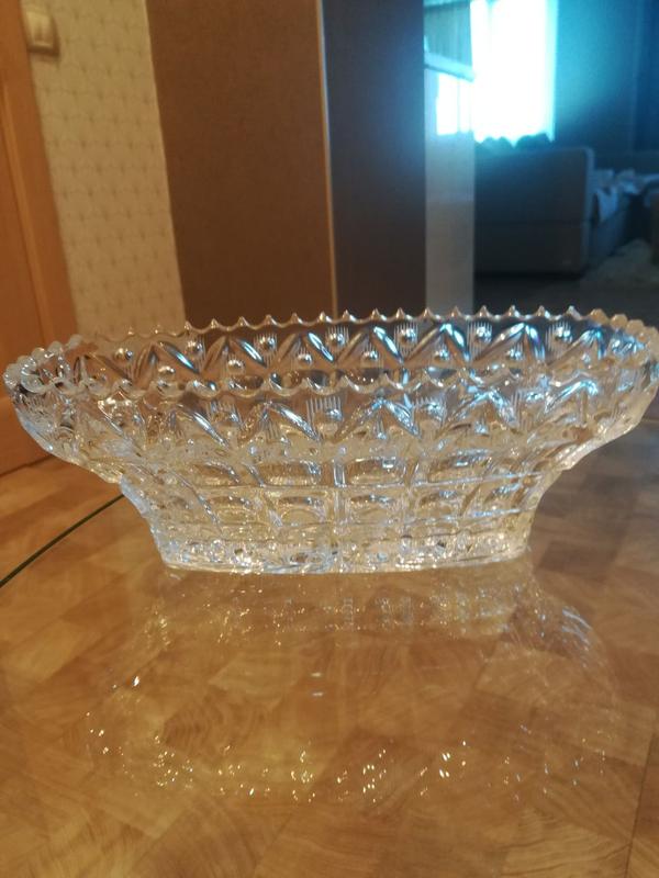 Кришталева салатниця у формі човна з якісного кришталю 80-90-х років. Містка, стінки салатниці товсті, з красивим візерунком. Сколів і тріщин немає. Висота 9 см, довжина верху 25 см, довжина дна 16 см, ширина верху 13 см, ширина дна 7 см. В наявності дві штуки, ціна вказана за одну штуку. При купівлі відразу двох, можу зробити знижку.