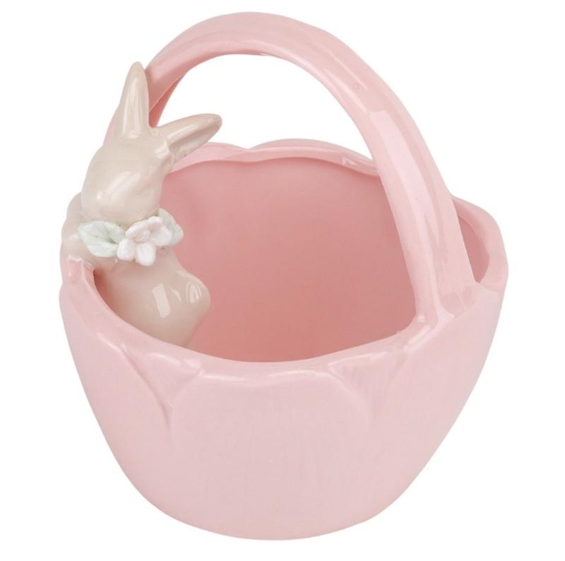 код товару 5009021 Висота з ручкою - 11,5 см, діаметр - 9,5 см. Керамічний кошик з білим кроликом – це ніжний святковий аксесуар, ідеальний для декору великоднього столу. Його форма нагадує квітку, а витончена ручка додає вишуканості. Маленький кролик із квітковим декором на краю кошика надає виробу особливої чарівності. Цей кошик можна використовувати для подачі крашанок, солодощів або декоративних композицій, створюючи затишну атмосферу свята.