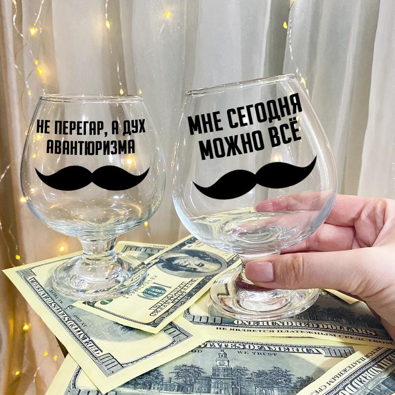Набір келихів для коньяку з написами "мені сьогодні можна все і не перегар, а дух авантюри...