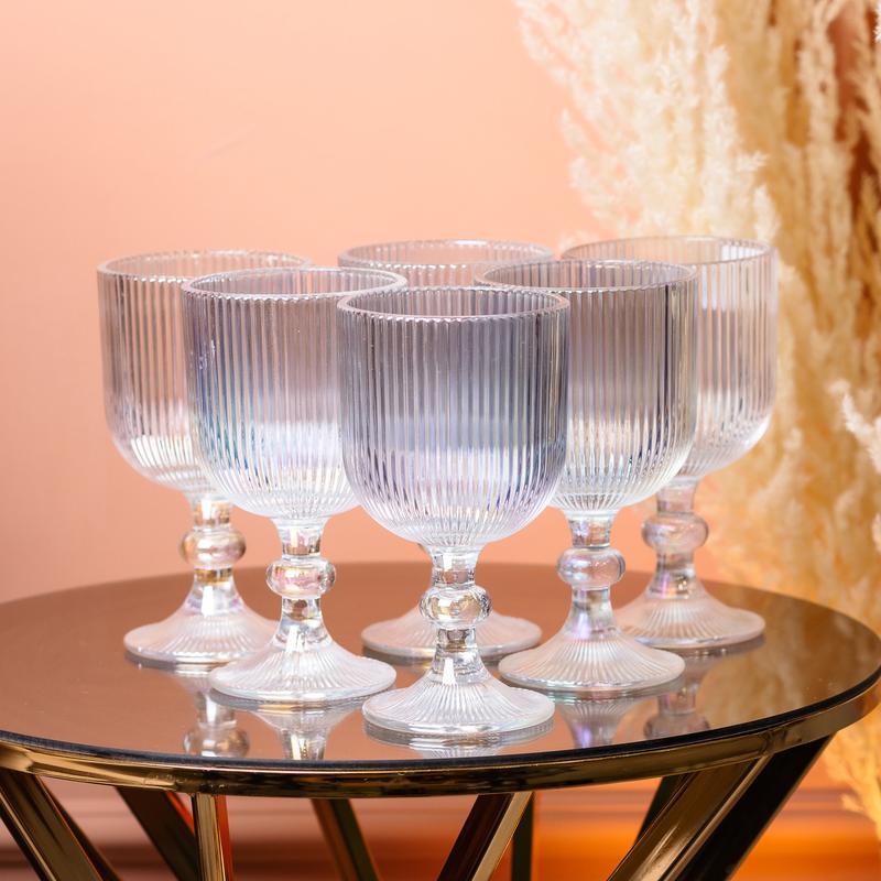 Набір скляних келихів 6 шт відрізняється стильним вінтажним дизайном та відмінно підходить для різних напоїв. Для виготовлення ємності використано якісне безсвинцеве кришталеве скло, яке не вбирає запахи, не змінює смаку напою. Келих підходить для миття в посудомийній машині. Для ручного миття рекомендується використовувати неабразивні миючі засоби та м'які губки. Характеристики: Тип: келих Матеріал: безсвинцеве кришталеве скло Висота: 16 см Діаметр: 8,5 см Об'єм: 300 мл Можна мити в посудомийній машині: так Кількість у наборі: 6 шт