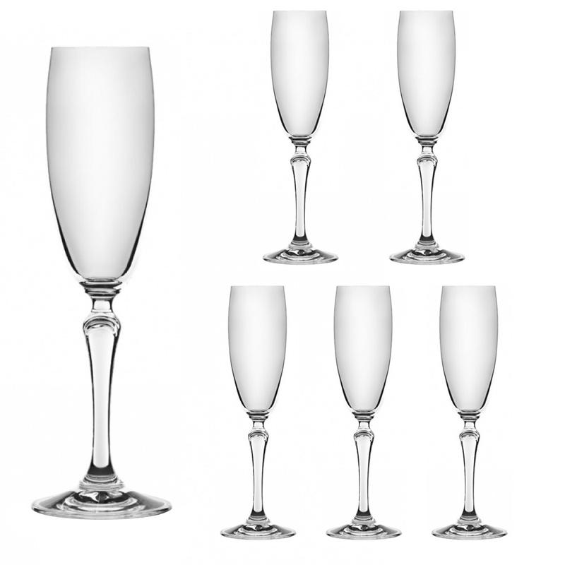Набір келихів для шампанського типу Флют. Виготовлені з богемського скла, що з давніх часів славиться своєю якістю. Назва цього типу келихів походить від англійського слова флейта. Форма таких келихів дійсно нагадує цей інструмент. Вона підходить для шампанського найкраще, тому що сприяє рівномірному вивітрюванню бульбашок і розкриттю аромату напою. Довга ніжка потрібна для того, щоб тепло вашої руки не передавалося напою – це псує смак ігристих вин. Не наповнюйте такі келихи більше ніж на три чверті. Їх можна мити в посудомийній машині, на делікатному режимі.